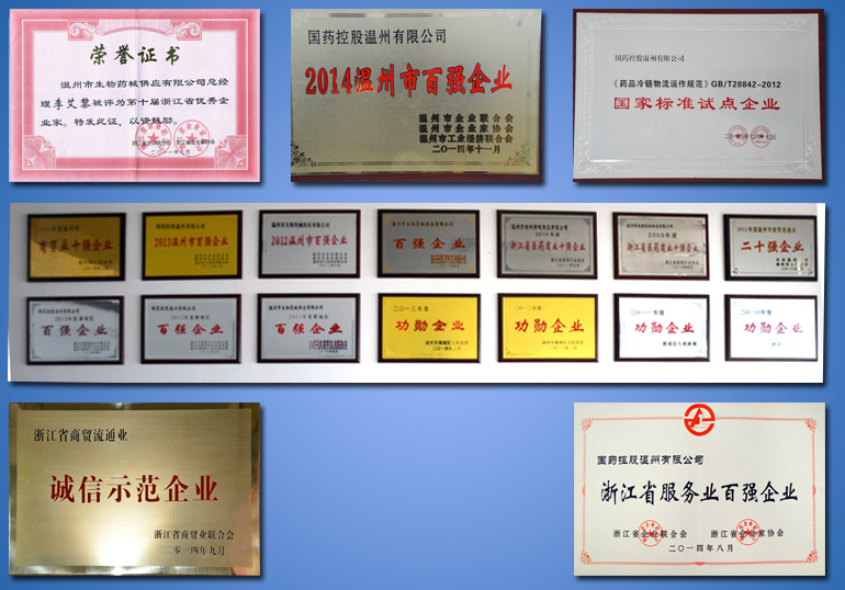 2014年被評(píng)為浙江省重點(diǎn)流通企業(yè)、浙江省服務(wù)業(yè)百?gòu)?qiáng)企業(yè),浙江省商貿(mào)流通業(yè)誠(chéng)信示范企業(yè),《藥品冷鏈物流運(yùn)作規(guī)范》GB/T28842-2012國(guó)家標(biāo)準(zhǔn)試點(diǎn)企業(yè)李艾黎總經(jīng)理榮膺2011年浙江省優(yōu)秀企業(yè)家稱號(hào)